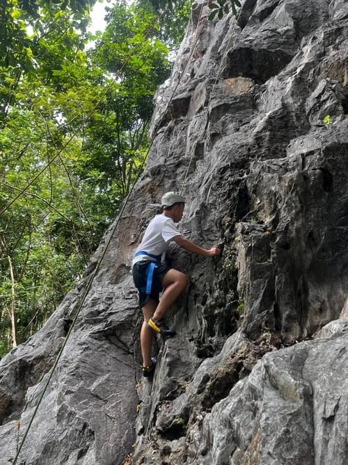 Students climb natural rock walls under full supervision, learning trust, focus, and courage through every ascent.
